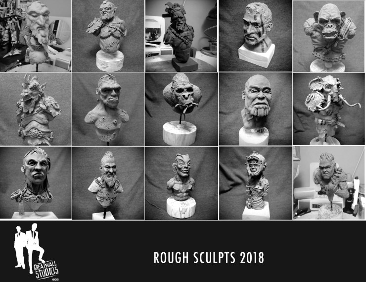 A quick snap shot of this years Bust Sculptures. Trying to decide if I’m going to get back into doing full figures, or keeping with the busts, but adding in one or both arms to help tell the story. So far I only have plans for a Wolverine® and a Koko the gorilla tribute bust. Will have to plan out something for the Markham Fair this year, not certain if I’ll use the Goblin Warrior from January or not. Faces are getting better, but I do need to clean up the ears, and make the eyes more consistent. Bilateral symmetry is also eluding me thus far. May have to bust out the calipers instead of trying to eye-ball it.