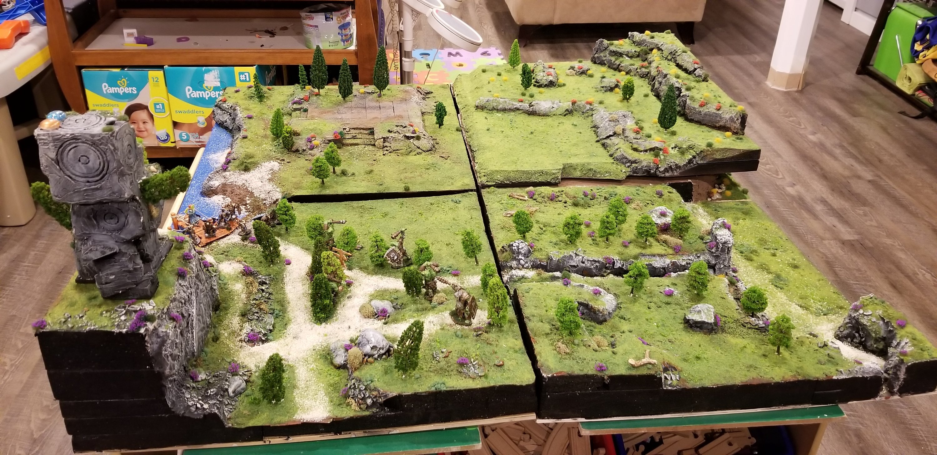 A bitter sweet moment has arrived now that I have completed the entirety of my four terrain boards to build one large interconnected 4ft by 4ft gaming table. Just in time too, as I came perilously close to finishing off my modpodge, ground cover, spring & summer grass flocking, foam stock and various colours of paint. Not to mention the store bought pepples and decorative sand. Phew – it was a nail biter. All of my best trees were used and the last few are so tiny I’m not sure how or what I’d ever use them on. Without further ado, I present my newest war gaming terrain build, and the final grouping.