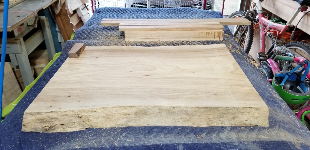Another rainy day on the books. Good for the grass, flowers and crops, not so good for mowing the lawn or staying dry when outside. No matter. I’ll bump the yard work to a day when it is dry, and will focus instead on any paid work, and/or hobby items while I still can. I managed to break down the rotten slab yesterday into workable pieces. One live edge top slab, which I took a series of hand planes to today for about ninety minutes. I have a walnut chunk chosen for a single bow tie I need on the top surface. I have multiple strips of 1.5 inch wide by .75″ thick hickory strips. Two are thirty inches long, the other two twenty inches long. This will form my skirt portion, where I will attach legs, via a lap joint on two faces that touch in a corner. I will make tenons for the top of the legs to fit into the slab top. The slab top itself will receive four mortises for those legs. My big question to myself now is, do I use finger joints, box joints, a mitered edge or butt joint for the skirting? Or try out dovetails for the very first time? I do like the chunky look of box joints. Seems like a classic joinery to use on a chunky, fat, small slab coffee table. I haven’t decided yet if I should make a drawer or shelf underneath the slab. Then it could double as a night stand at the cottage, if I don’t keep it here at home. Decisions for another time. I will think on it, and worry about that later.