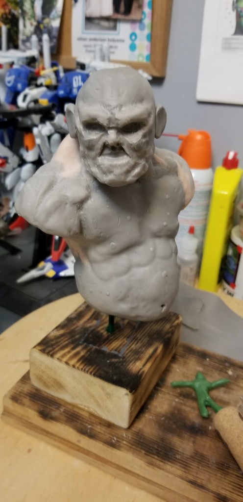 Also on the docket is my latest ogre sculpt in Super Sculpey. Progressing slowly but surely. Working my way through the head now. Ears and eyes to go at this point. And then hair. Smooth him out, texture the body, and then build up his clothes. I see mail, a hood that wraps his neck, various straps of leather, with wool padding underneath, possibly a shoulder pauldron of immense size. A wide belt with skulls or weapons or wine skins adorning it. Nose ring, earrings, and tokens woven into his hair. A huge shield slung on his back. A war hammer or crows beak over the opposite shoulder to the armor. Not to go crazy, but I’d like to have options for this one. Maybe I’ll even attempt a helmet this time. We’ll see how it goes.