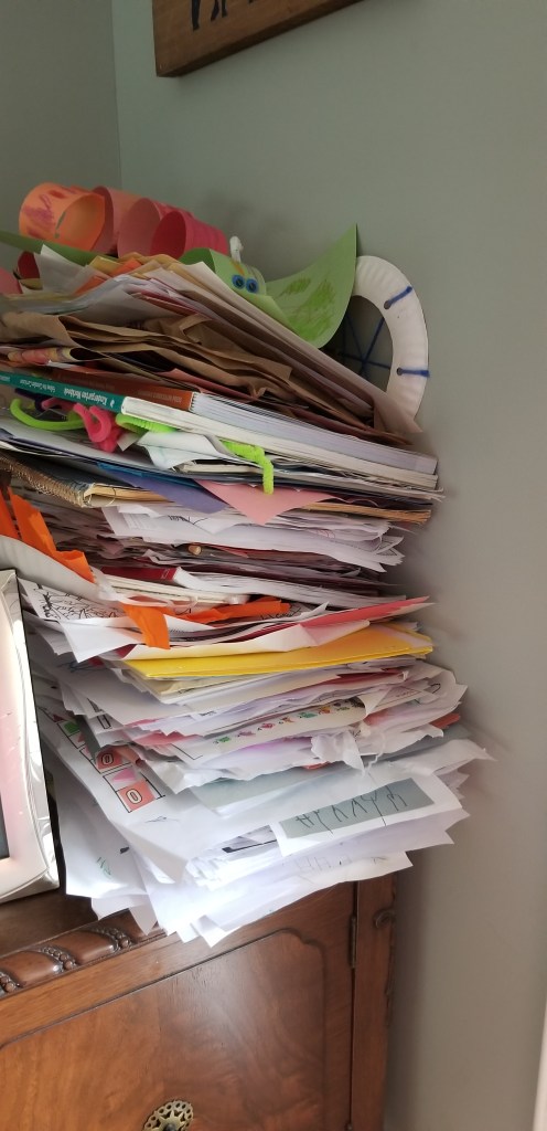 It’s hard to describe it, but the living room now feels peaceful since I put the shelf unit in yesterday, and spent an hour or two cleaning up. It won’t last, it never does, but for the moment I feel at ease in the space. Which I haven’t done in ten weeks or more. I probably should have given it another few days to finish off gassing both the stain and wax polish finish. But it’s not awful, and the peace of mind is almost zen like. I can see the floors again. I didn’t step on any toys and injured my foot before school. I didn’t kick a thing, my toes (this far) are un-dinged. Blissful. I do have a stack of recycling to tackle that’s about 18 inches tall though.