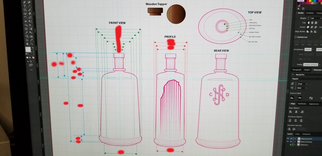 As a side note, I just saw the other day, a distillery that I did work for designing a brand new proprietary glass bottle for their whole range, has finally gone to market, and the glass bottle look amazing. They went another way with the label designs, but the glass bottle with the waterfall element on the shoulders looks phenomenal. We tried versions with ripples on the neck, bubbles on the thick base, and all sorts of neat things. Embossed text along the bottom thick base, and more things than I can remember now that we’re about 2 years out from the thick of it. I know we had many conversations about the limitations of the moulds, and how you can & can not get hot glass out of them with specific items we’d hoped to achieve, but I am super impressed with the final product.
