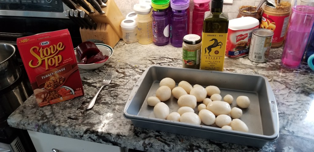 I didn’t even think about it until just now. Can I substitute in some Swiss Chalet dipping sauce from a pouch into the mix? Kids won’t touch gravy anyway, so no love lost there if it’s missing. But the wife and I will be looking for it with both eyes open. So update to plan. Once turkey comes out to rest, I put the heat up for potatoes, and immediately do the stuffing. Clean that pan, and use it for gravy. Small mix up, but something we can bounce back from!