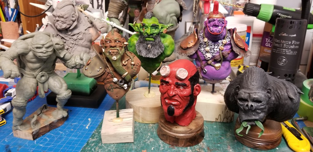 I the last few months I have completed my Ape, Hellboy, Elf Barbarian, Warrior, and now my Ogre Royal Guard. I went in vastly different colour palettes for each one. As I tend to like greens and blues, and didn’t want them all to be exactly the same. I should try a blue one next, as I’ve gone through Pink & Purple, Reds, Blacks & Greys, Various shades of Brown, and Green & Yellows. So my Ogre Rogue should be blue. But I kinda want him to look more human, and go with skin tones instead. Maybe I will try the Ninja Turtle next? Either way, I will need to sculpt some new things, if i want to continue painting into the new year. Or pray that the large box of miniatures I picked up off of Kickstarter shows up in the next 3-6 months.