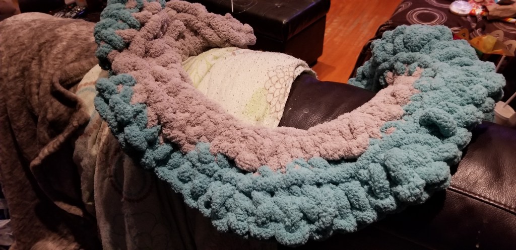 My oldest is a part of the public school’s *Craft Club*, and has taken quite handily to things like Rainbow Loom and now Crochet. So with a massive grin, and a fair chunk of effort she spent some time over the last week teaching me how to do it. I am now 64 yards of bulky thread into a blanket project of my own. A few things I have learned. 1.) Count your stitches. 2.) Orient the work so it flows better for you. 3.) A blanket will require atleast 300-400 yards of bulky thread, unless I plan to make a floor mat sized blanket for an infant. 4.) Keep your work flat so you don’t create a warped spiral. These are things I learned after doing the opposite, so I now have one tenth of a warped, spiral blanket, with missed stitches. Ha. However, I appreciate the time spent with my oldest child chatting, and working on potential Markham Fair entries.