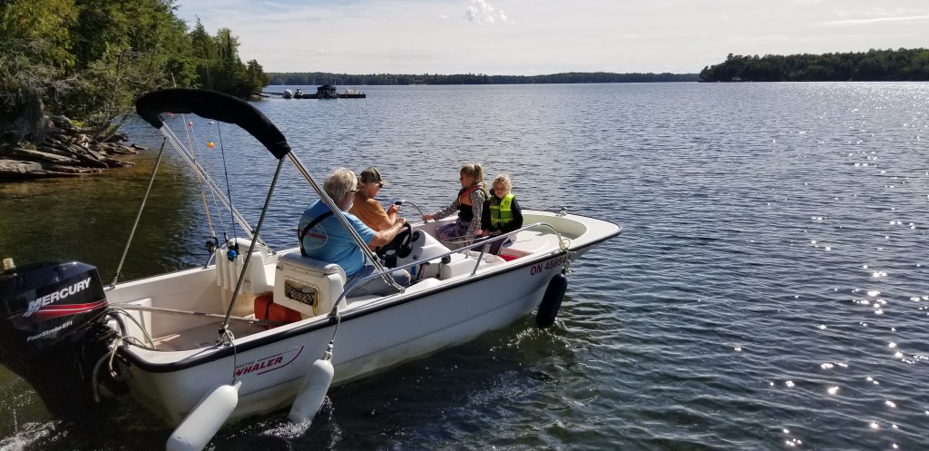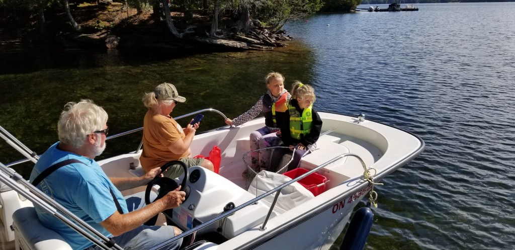 Kids desperately wanted to have a bon fire with jiffy pop popcorn, and do some more fishing. But these early sunsets meant we ran out of time to do it all on Saturday evening. So grandpa and grandma took the girls out on Sunday morning for a couple hours in the sunshine to try and catch more fish. Off the dock our best haul was 12 six to eight inch long fish at one time. All returned to the lake out of the holding bucket we were using with lake water in it. Off the boat they were less successful, but had fun nonetheless. Lots of nibbles and stolen worms, but no fish brought in after a hearty struggle on the line. This time.