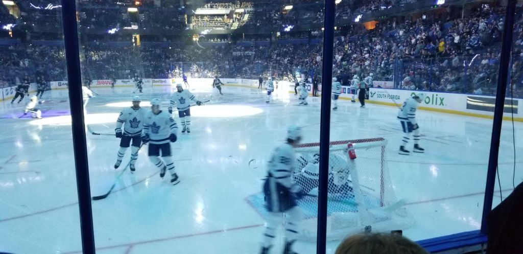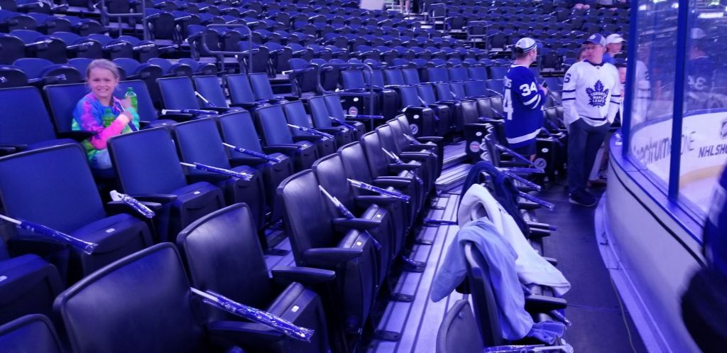 We left a full 2 hours prior to the game as I dislike driving in the US, and I didn’t know the location, nor the parking situation. Took us less than 23 minutes to get from the hotel to a nearby parking garage just up the road from Amalie Arena. $20.00 event parking, in a covered garage was a steal! We walked the two lights down to the arena in a swarm of blue & white. Half Leafs fans and half Bolts. As we approached the front steps they opened the doors so we need not stand around in the 90°F heat. We scanned ourselves in on the promenade level, and proceeded to hit both the bathrooms and the beverage counter. Found Section 109, Row D and Seats 5 & 6. Marveled at how close to the goalies we would be, and had a blast for nearly three and a half hours. Saw the pre-game warm up skate. Heard the slap shots ricochet off the glass like gun shots, and saw most players at arms length distance. Just a great time for my eldest daughter and I to have together. Our first NHL game, and what seats! Oh such seats!