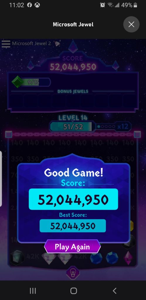 Now I don’t know if that qualifies as a good score or not. I have yet to pass level 14, and most times I play it I crap out between levels 11 and 13. I have had the luck of doing a handful perfect clears, which is nice. But I can’t seem to find a solid plan of attack that wields great results. Planning my moves doesn’t go any better than just randomly finding the first groups of three that catch my eye all across the screen. I wish I knew of a way to eliminate the black rocks in a more efficient manner than just hoping they get caught in a flashing jewels explosion. I have limited myself to playing once per day. I get bonus points for doing so. Maybe twice if I have a long empty part of my day. I know it’ll kill 20-30 minutes if I let it.