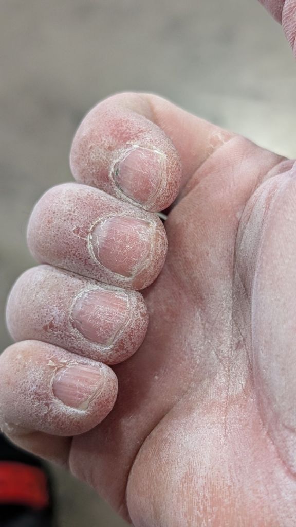 Also if you would like your soul crushingly tight climbing shoes to not leave you hobbling around, you need to cut your toenails otherwise the pressure of the near constant squeezing will make the inner most portion of your cuticle separate from the toe nail bed, and you’ll end up with bloody socks, and red blood filled lines across your toes.