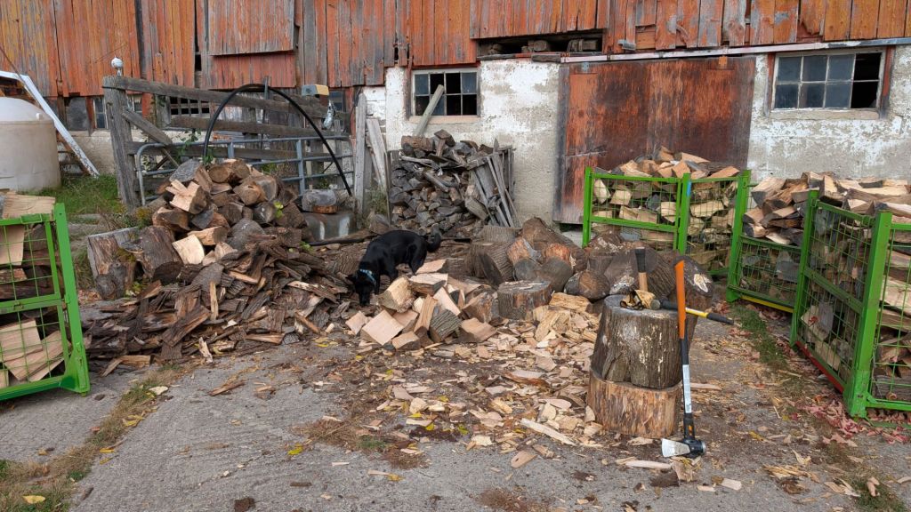 I have six bins filled, with enough to fill one more, plus whatever becomes of the as of yet unsplit wood by Pile Two here.