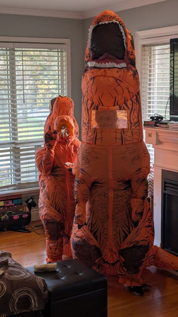 Like the Halloween costumes. Oh boy. First they were acolytes from 99 Nights in the Forest, so I had to buy plastic weapons, namely an axe, and a crossbow. No crossbows available, so a bow & arrow was a suitable replacement. Then my youngest wanted to be Kraken Kid because they can’t have weapons (fake ones) at school, but she can be a squid headed child in light blue pants, and a white T-shirt. But then they wanted to be T-Rexes with inflatable costumes, and it took a few days to come to a consensus on colours. So once they choose Orange of all things, it was a non stop litany of “won’t it be cool when…” Statements about the T-Rex outfits for a week straight.