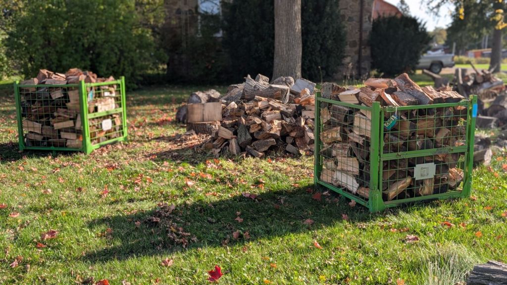 **EDITOR’S NOTE: Stacked two and a bit rows in the wood shed, and freed up five green wire bins for more split wood, so now I don’t actually have to stop if I don’t want to. Yahoo! I can fill three wire bins with what I’ve got split already, which is awesome, and then I can direct load into the bins as I go removing a second step of loading out the piles later. I’ll have to see which work flow moves better, spending a week making a pile, then using one hour on a Friday, or the following Monday to load up the bins, or chucking my splits directly into the nearest bin as I go. I think it will depend mightily upon the wood itself. Stuff that falls apart at a look can produce a much greater pile over a shorter period, and may take more effort to toss where needed. We will have to see. My hands are getting weary from handling the piles so much, but climbing, and axe swinging means my forearms won’t be solid unusable bricks tomorrow. And that’s a good thing!