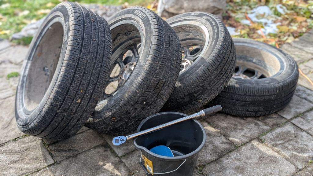 But the job is done, so I’m satisfied. It actually stopped raining, and got up to around 6°C so it wasn’t frigid outside getting the tires off. I wore work gloves because even if the air temperature is ok, that doesn’t mean metal items will be too. Working with fat numb fingers is no fun either.
