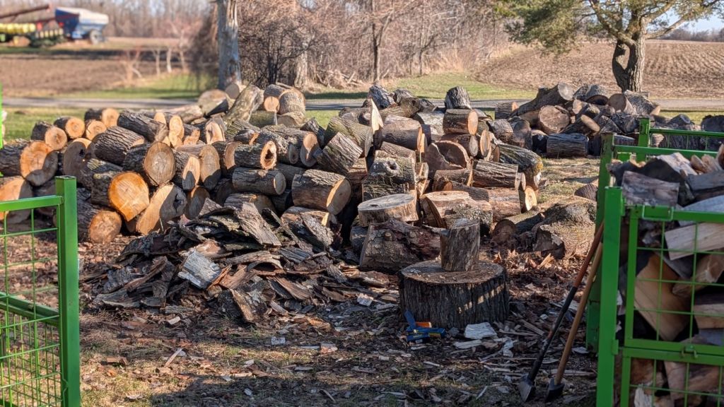 The children were tasked with picking up pruned apple branches out of the nearby orchard, and I was there to provide them a ride both to, and from the farm to do the work. I took those 75 minutes to split several rounds for the first time since October, and attempt to fill one of the green wire bins. Almost did it too! Mind you I started by putting the final pieces of last year’s splitting work into the bottom of the bin, and then I chopped enough to nearly fill it right full. I think one big round split up a bunch would actually complete the bin, but I was still impressed with my old flabby self for chopping for 75 minutes straight.