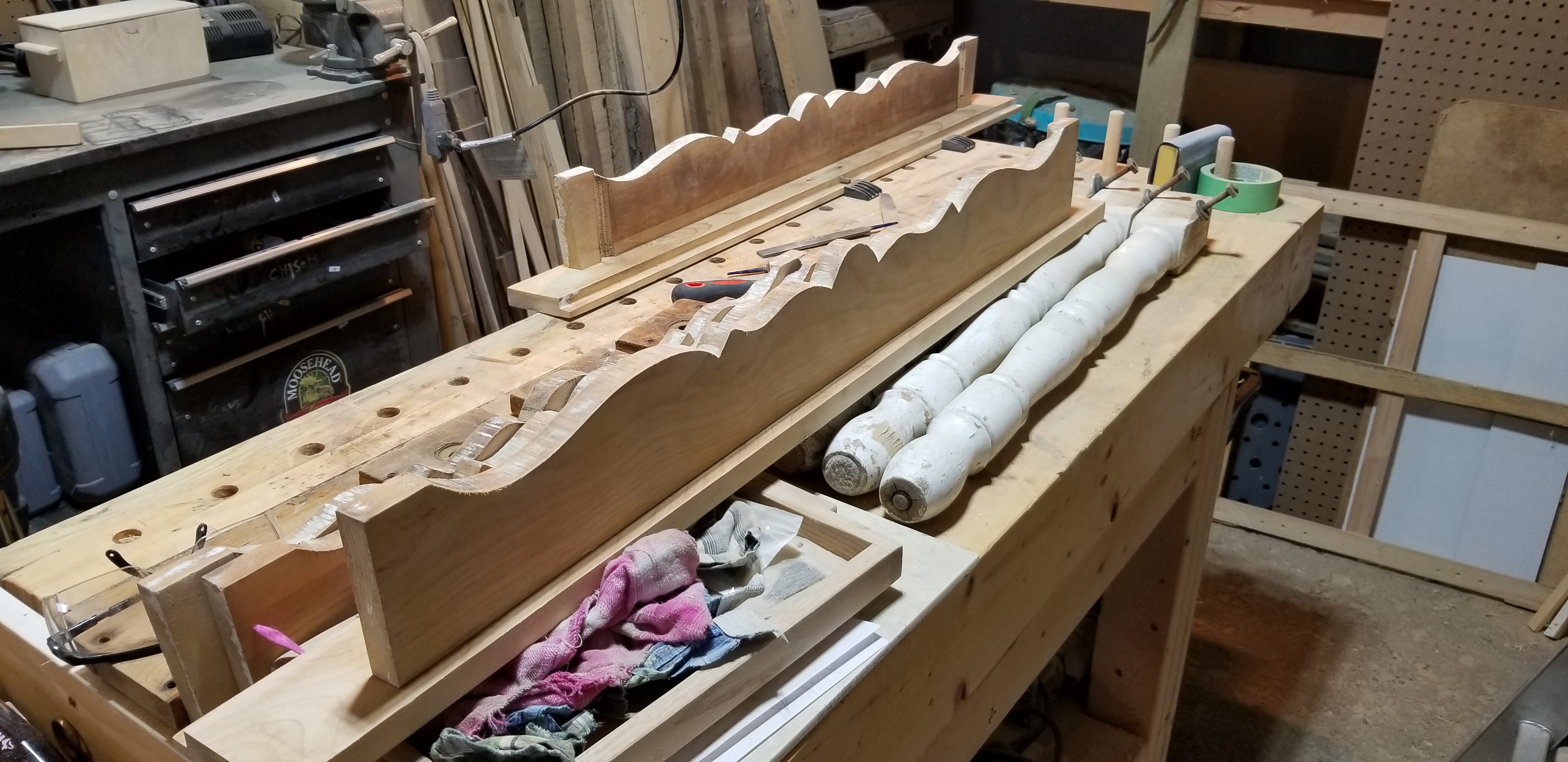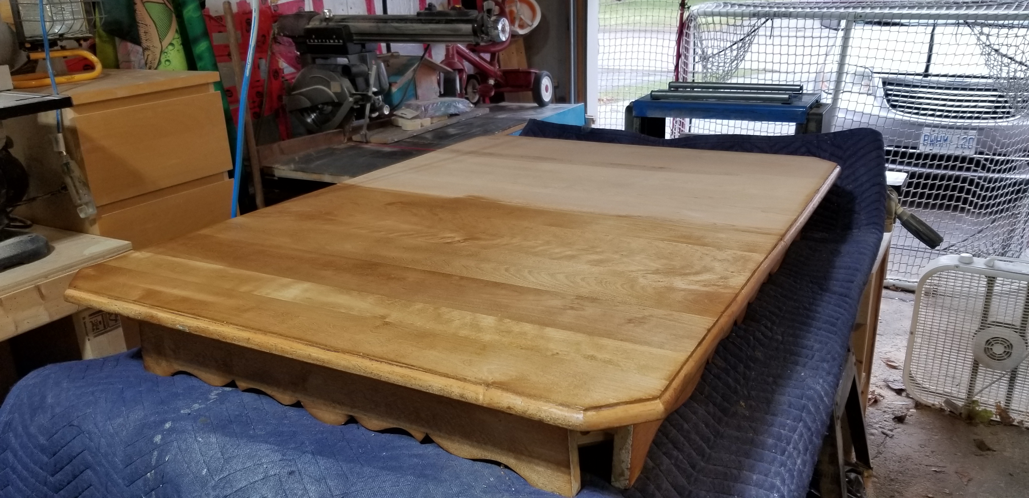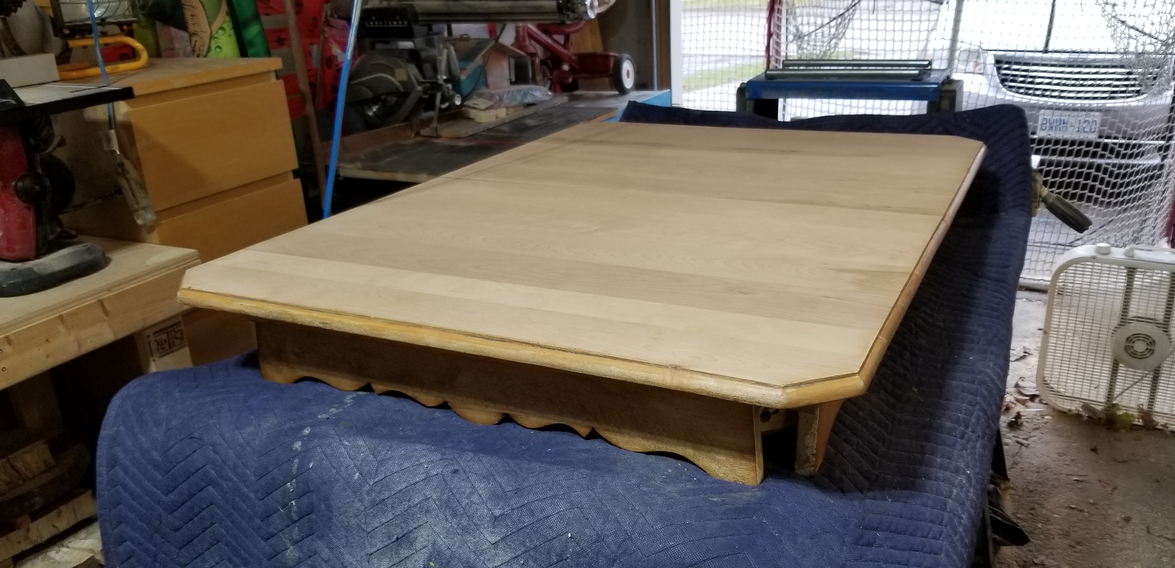 The one that started out being about turning two book matched Hickory slabs into one monolithic water fall edged table, with a fat & chunky Ash leg on the opposite end. Then I pulled the slabs out from storage and the small one was perfect, and the show piece was cracked in three so badly it snapped in my hands. So new idea. A smaller coffee table using one live edge slab as the top, and the broken pieces of the other as the legs. Then I hated the live edge aspect, and cut it down into a more traditional rectangle. Chopped the Ash chunk into four legs, and decided it was a boring blob of a thing. So I cut skirting, and then I thought, what if I use a Dado to inset the skirting on the interior side of all four legs. After that I figured I should add a drawer that was shallow, and use the skirting to hold up and slide the drawer out, rather than metal drawer slides. Much cheaper option too. Then I thought, well the drawer is so shallow I could build a slatted shelf about 6″ up from the bottom of the legs. I looked at my available raw materials and saw I had to go front to back with six slats rather than across the width. I was hoping to make it look and feel longer by running the open slats across the longer axis, but materials dictated I go otherwise. Not angry. My last vestiges of doubt were on just doing a clear coat vs staining with Danish Oil with a Walnut Tint. I don’t like the bleached look of Ash, so tinted stain we go! Now once all of this dries I will clear coat with a Varathane brand Diamond spray finish from a rattle can.